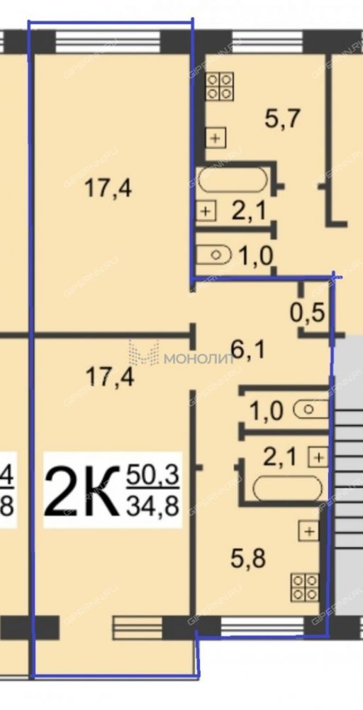 Отличная планировка: большие комнаты по 17,4 м. кв. выходят на обе стороны дома, квартира очень теплая. Летом прохлада. Кухня 6 м. кв. Санузел раздельный.