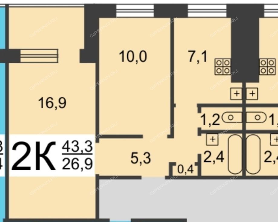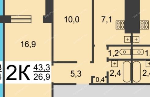 | Площадь | 43,3 / 26,9 / 7,1 |
