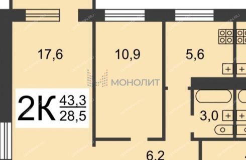 | Площадь | 43,3 / 28,5 / 5,7 |