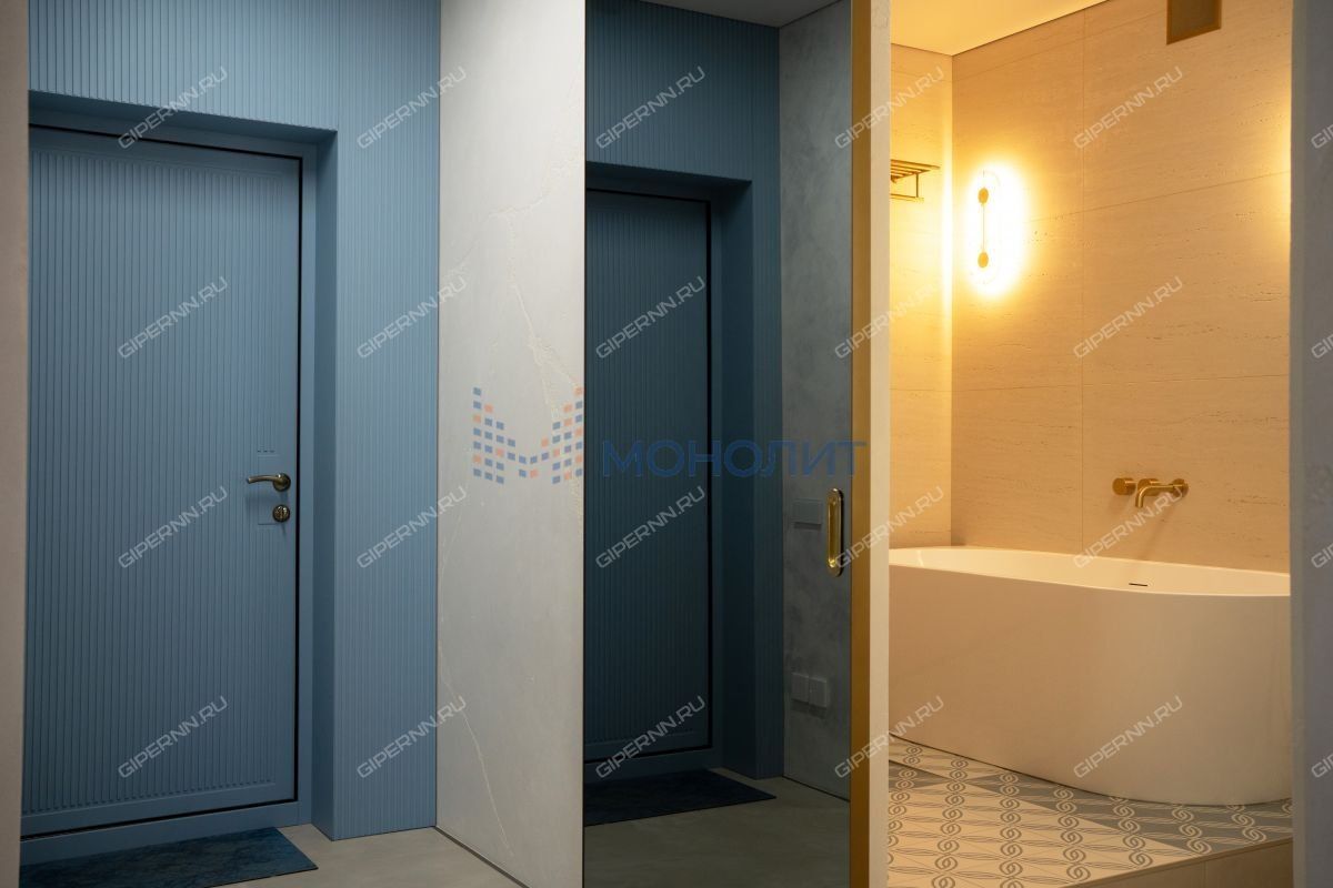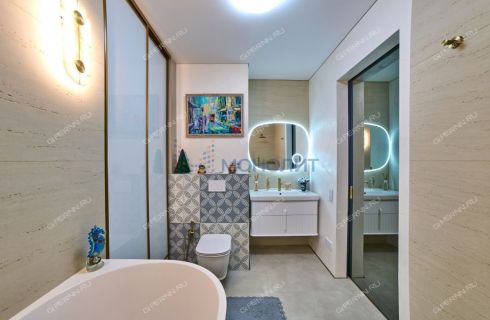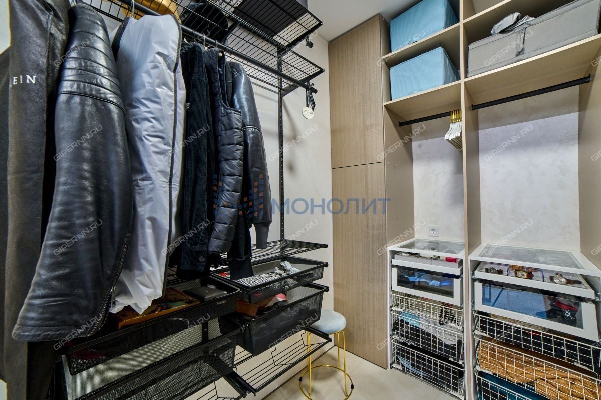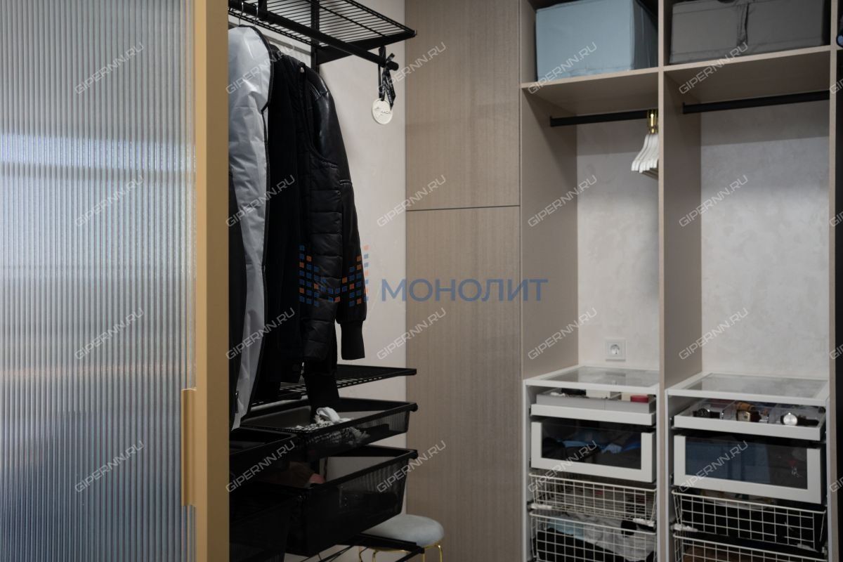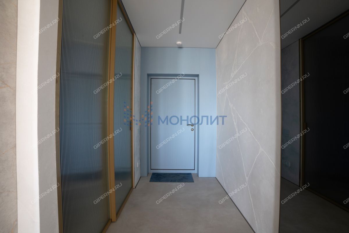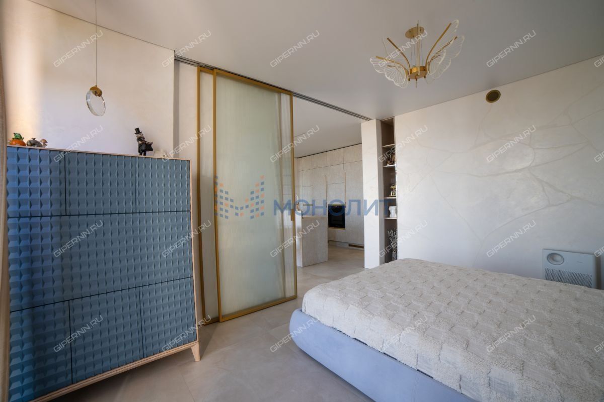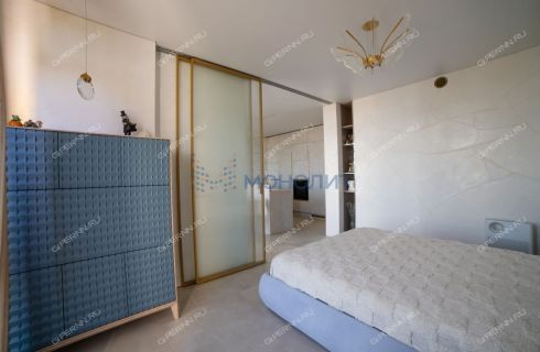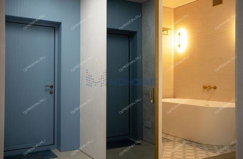 имитирующая большой камень. Пол выложен широкоформатным гранитом, качественные деревянные стеклопакеты обеспечивают комфорт, энергоэффективность и абсолютную шумоизоляцию. Каждая деталь продумана до мелочей: зоны разделяются раздвижными парящими из потолка подвесными дверями, а теневые плинтусы добавляют элегантности.Большая гардеробная комната обеспечит порядок и удобство для хранения вещей.