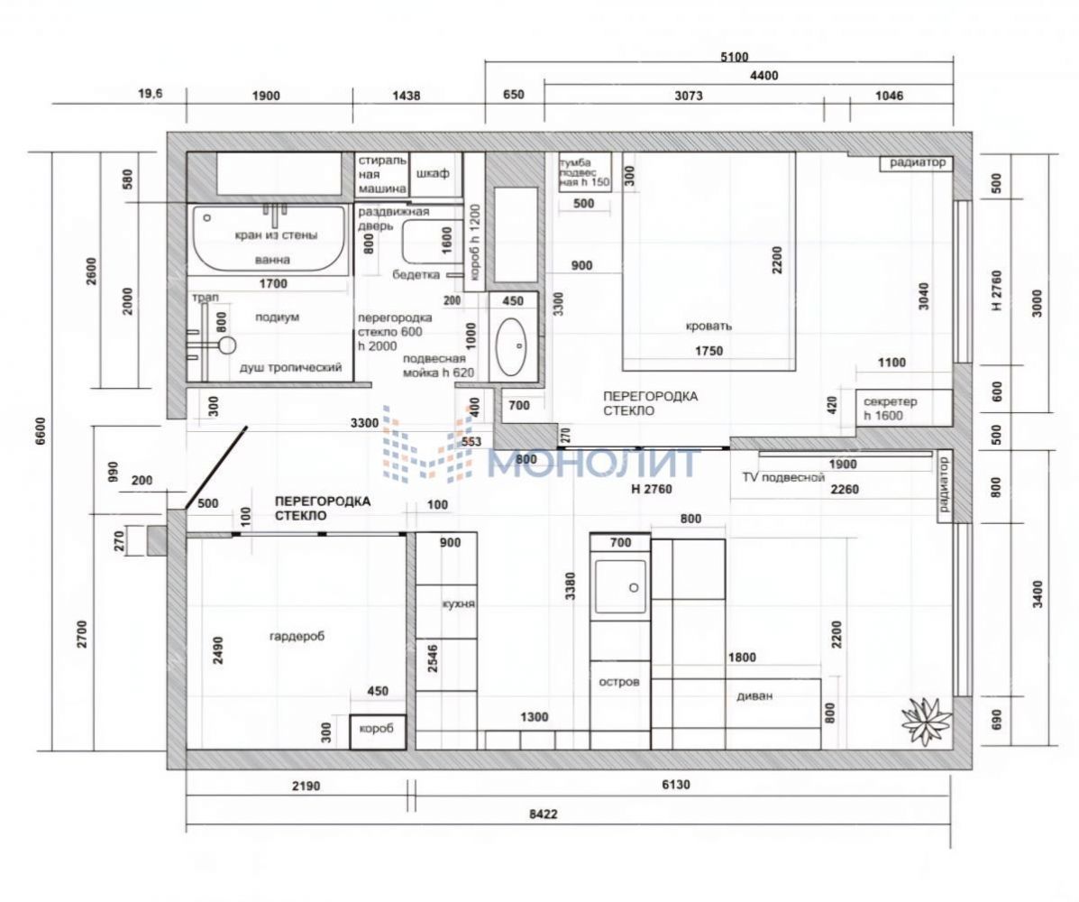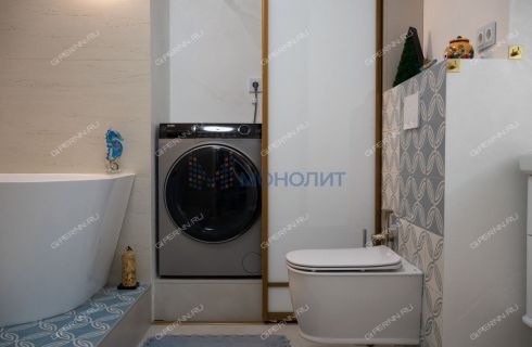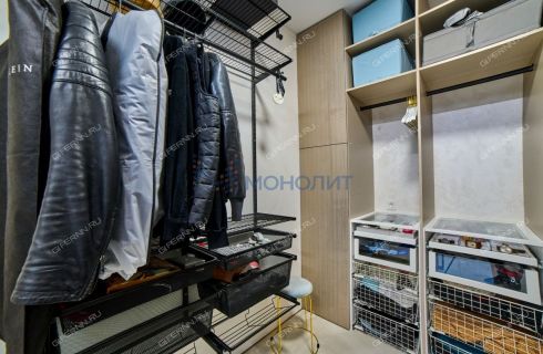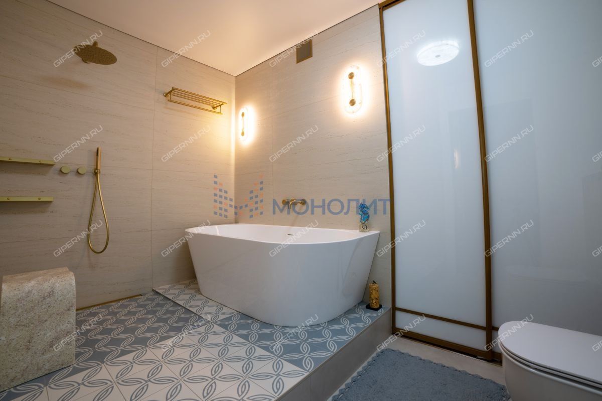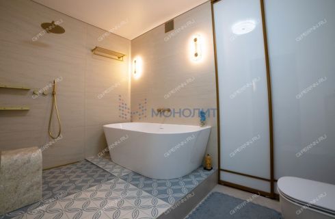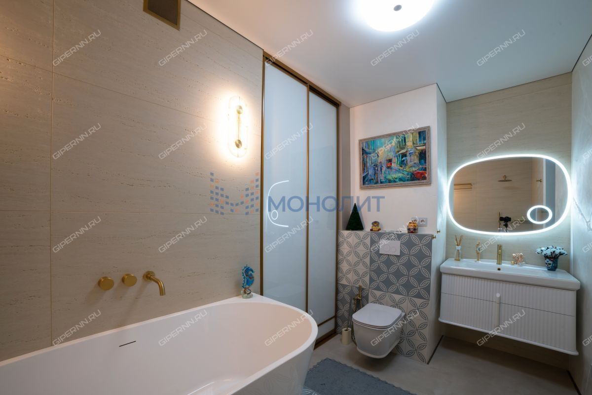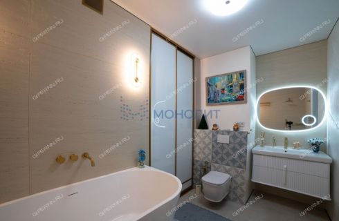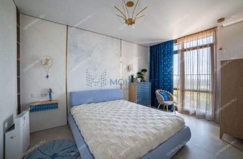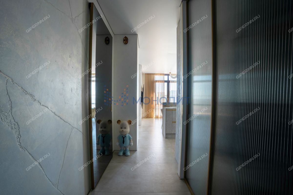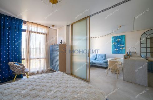 имитирующая большой камень. Пол выложен широкоформатным гранитом, качественные деревянные стеклопакеты обеспечивают комфорт, энергоэффективность и абсолютную шумоизоляцию. Каждая деталь продумана до мелочей: зоны разделяются раздвижными парящими из потолка подвесными дверями, а теневые плинтусы добавляют элегантности.Большая гардеробная комната обеспечит порядок и удобство для хранения вещей.