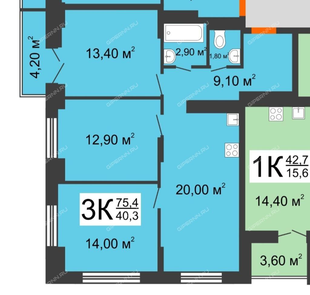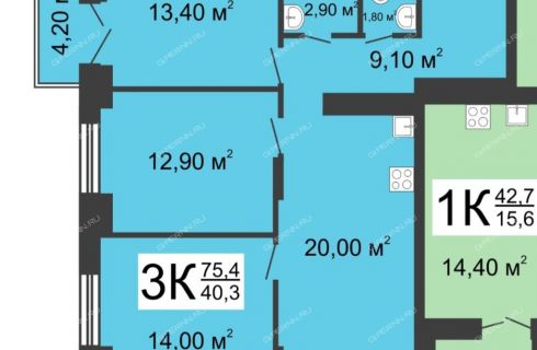 | Площадь | 75,4 / 40,3 / 20 |