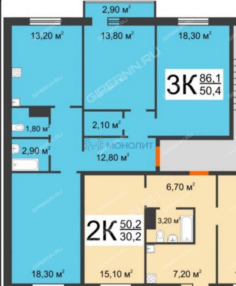 · Общая площадь 82 м²: 3 отдельные комнаты (13.8, 18.3 и 18.3 м²) и просторная кухня 13 м².