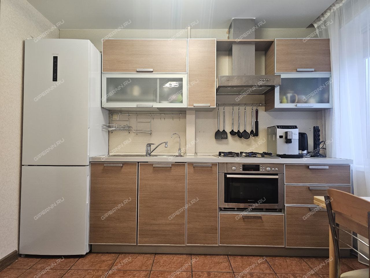 Кухня-гостиная - 18,4 (7,1+11,3 кв м: кухонный гарнитур, газовая панель BOSCH, духовой шкаф BOSCH с функцией СВЧ (2-в-1), вытяжка, посудомойка BOSCH, холодильник Haier, стол, 2 стула. Угловой диван, телевизор диагональ 43 Xiaomi -с функцией Smart-TV, тумба.