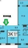 Комнаты изолированные на разные стороны (17 кв.м., 12,6 кв.м., 8.5 кв.м.)