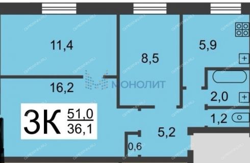 | Площадь | 51 / 36,1 / 6 |