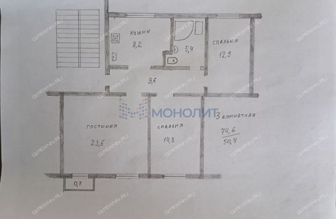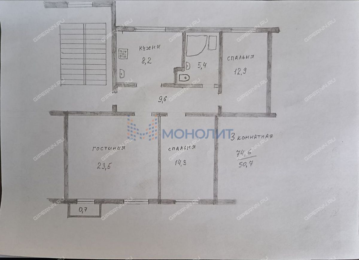 | Площадь | 74,6 / 50,7 / 8,2 |