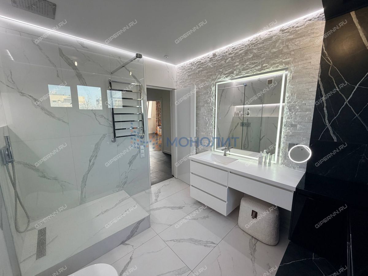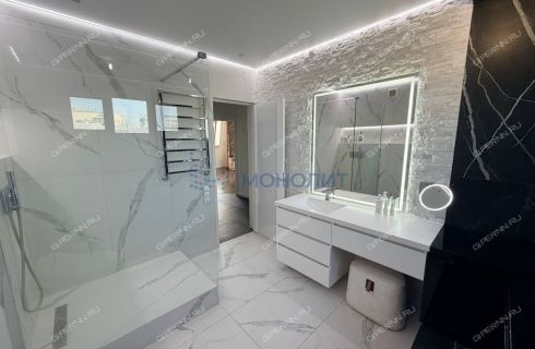 В квартире выполнен стильный ремонт с использованием современных технических решений и отделочных материалов, включая систему кондиционирования на базе Mitsubishi Premium Inverter, отопление Loten, остекление Velux и Rehau, теплые полы, светодиодное освещение, бесшовное напольное покрытие из натурального дуба и кварц винила (для удобного запуска робота-пылесоса), вертикальные поверхности из натурального камня, керамогранита и фактурной штукатурки.