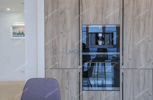Встроенная кухонная техника: кофемашина Franke; духовой шкаф Kuppersberg с функцией СВЧ; индукционная панель Kuppersberg; вытяжка Kuppersberg; холодильник Liebherr.