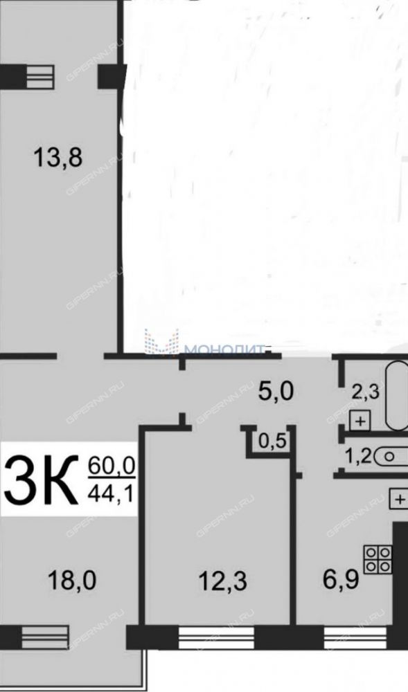 | Площадь | 60,2 / 44,2 / 7,1 |