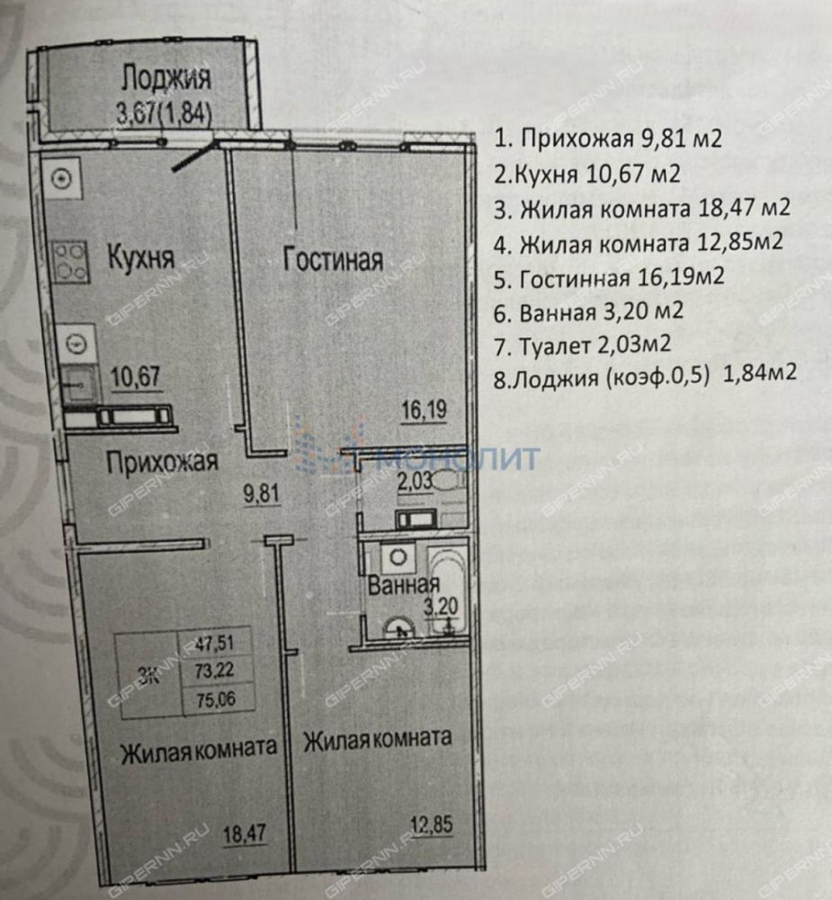 Три просторные изолированные комнаты 18,5, 16 и 13 кв.м., просторная прихожая,изолированный санузел, просторная лоджия 3,6 кв.м.