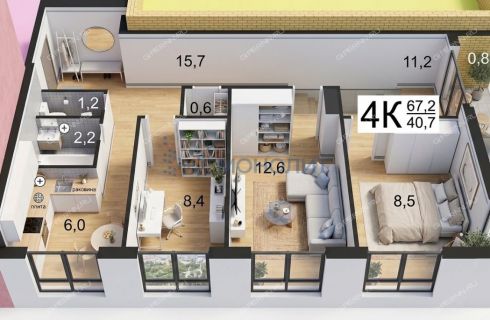 | Площадь | 67,2 / 40,7 / 6 |