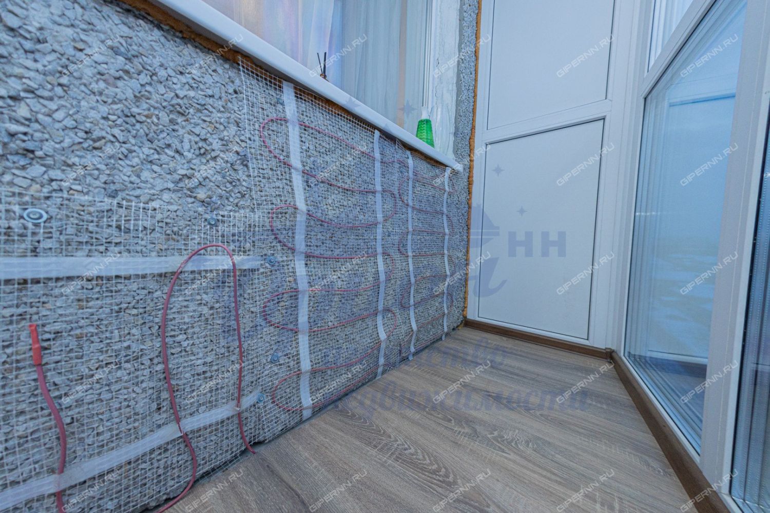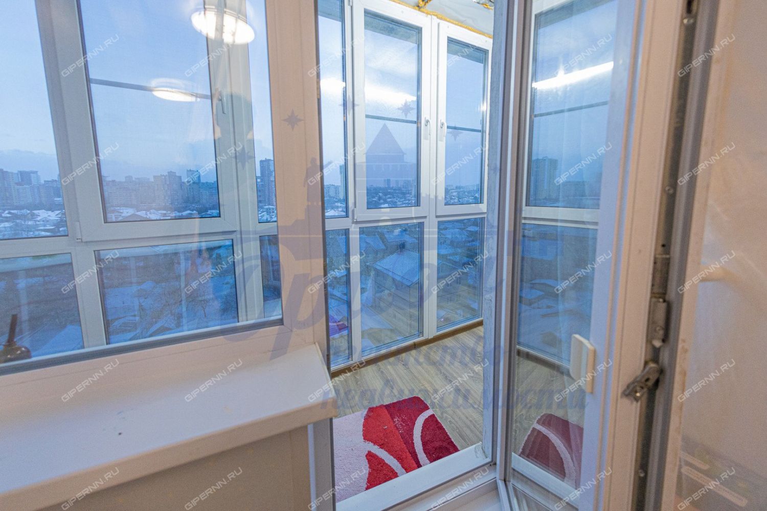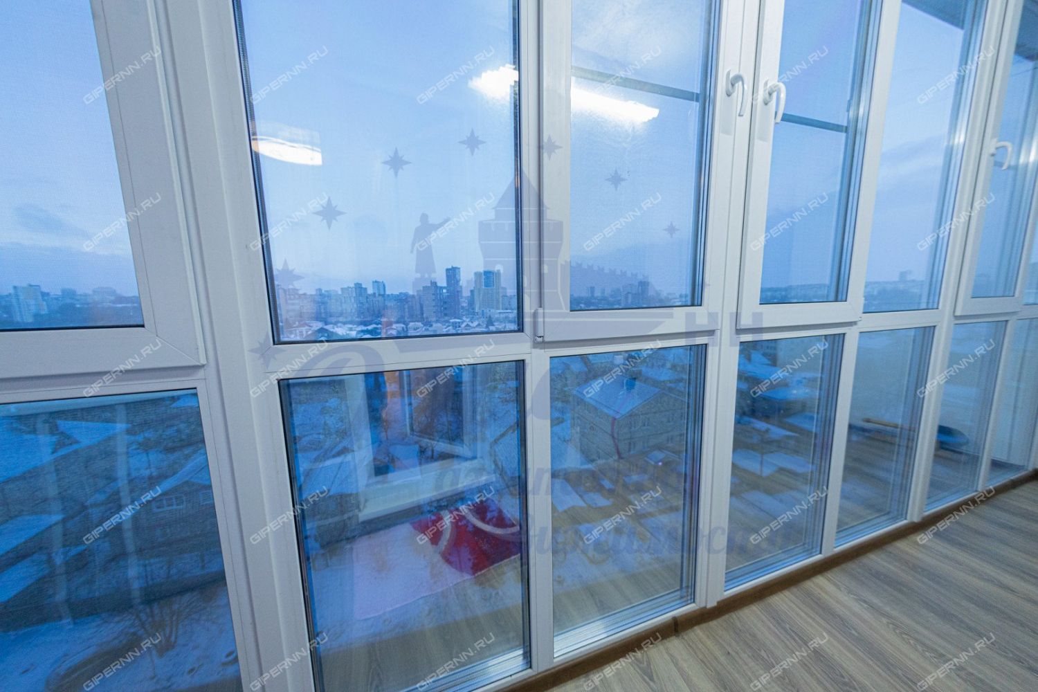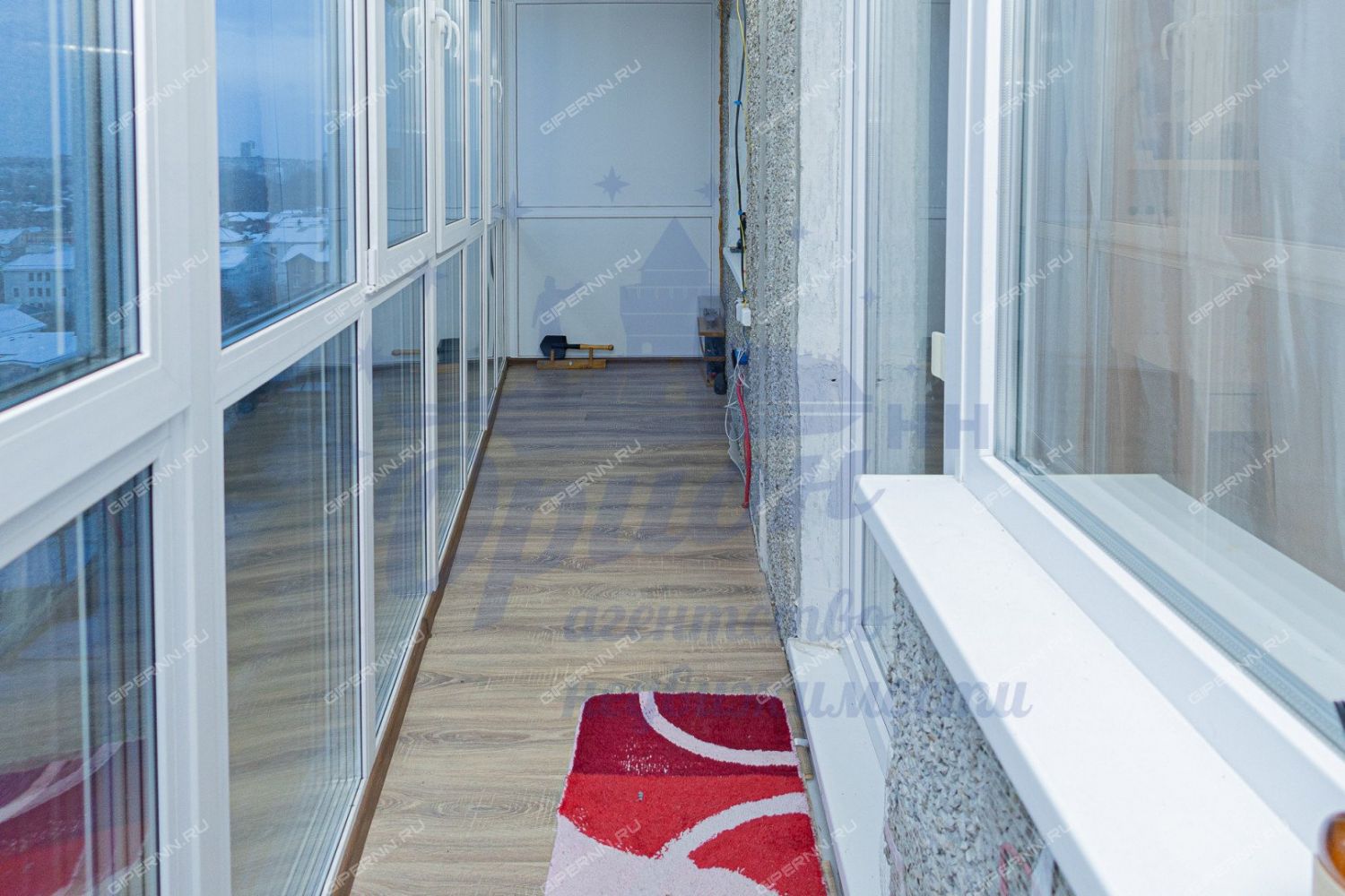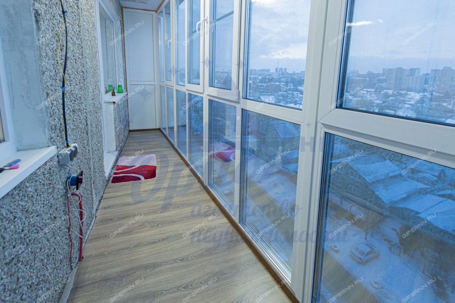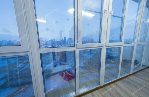 Особое внимание хочется уделить лоджии - панорамное остекление с затемненной нижней частью, тёплый пол, который выведен и на стену, на полу положен ламинат.
