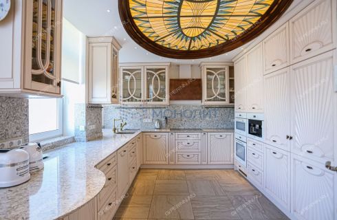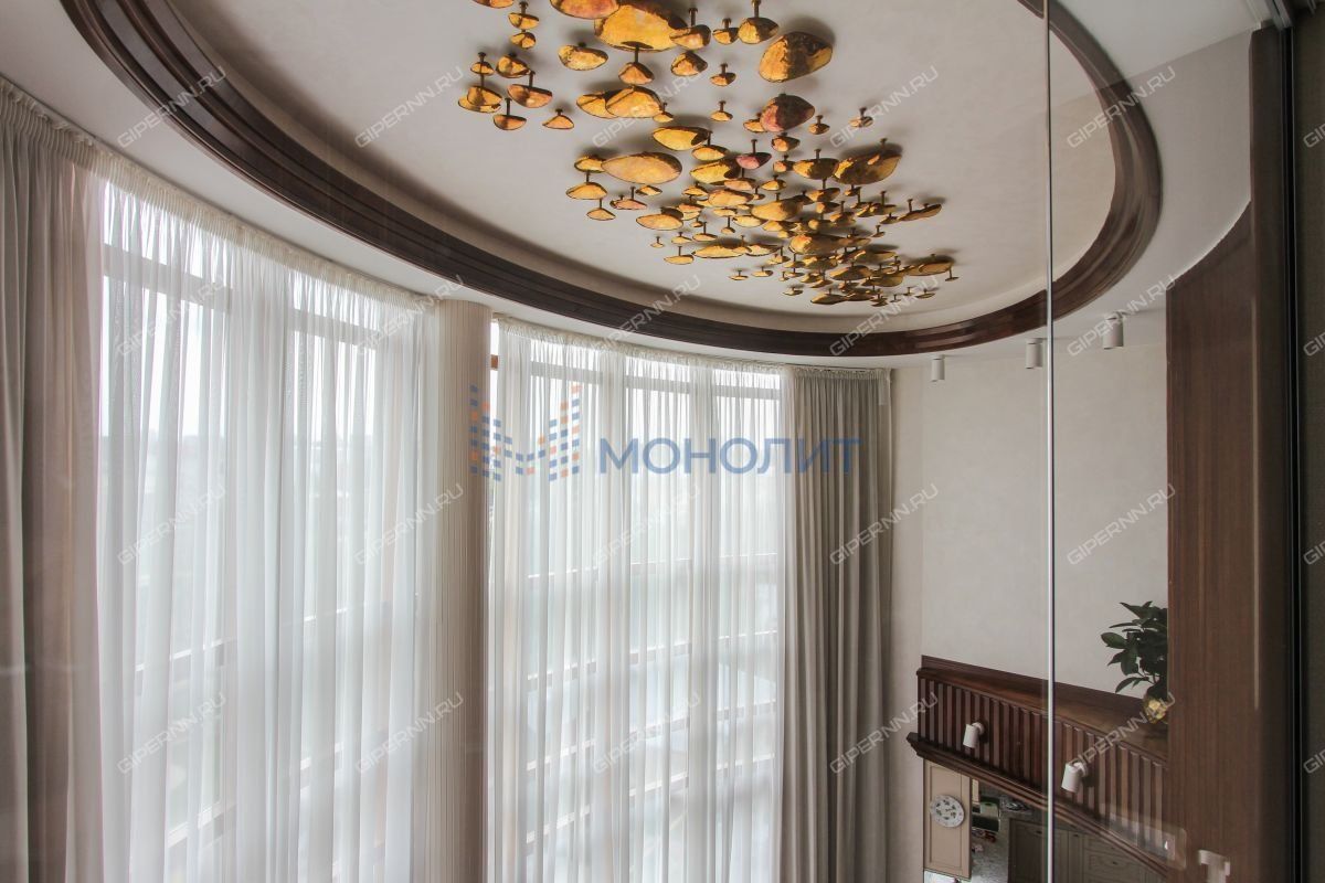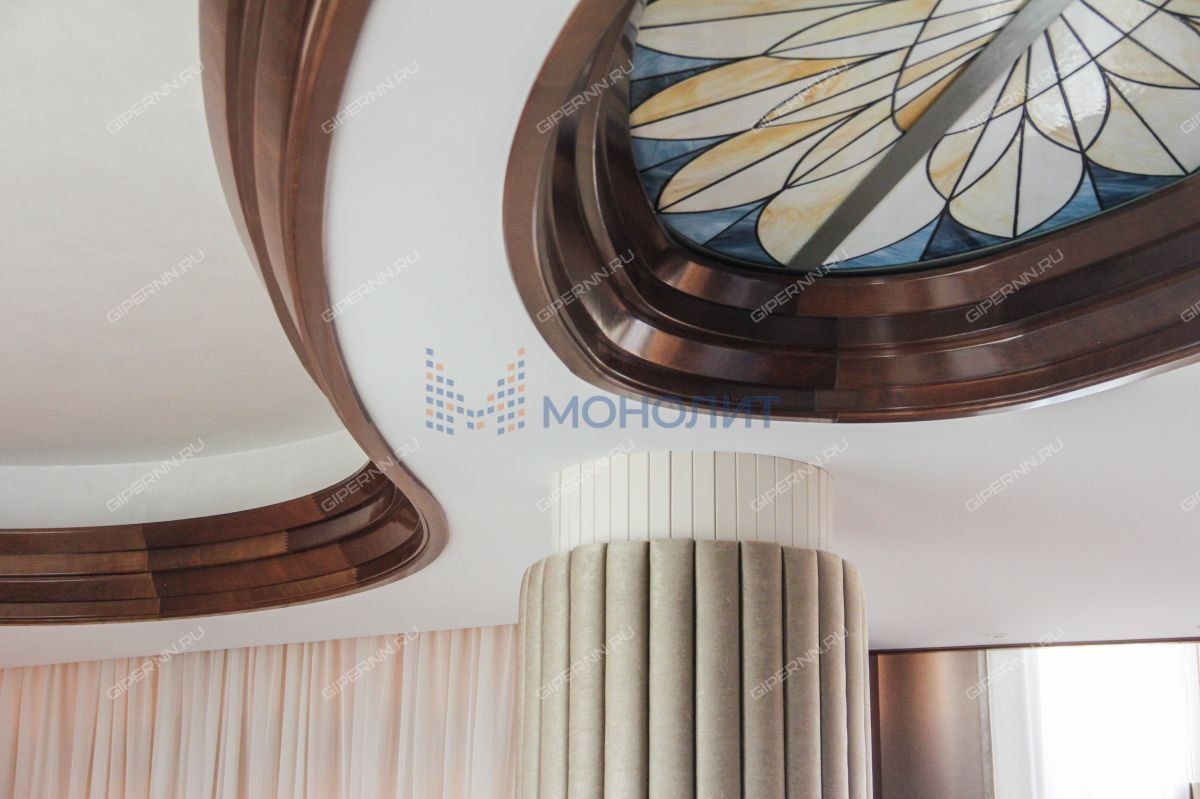 Изюминкой этого объекта несомненно является благородный и эксклюзивный вариант потолочного украшения - витражные навесные потолки. Свет, преломляясь через прозрачную стеклянную мозаику, окрашивает пространство в разные цвета и создаёт в помещении особую атмосферу.