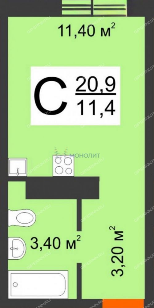 | Площадь | 20,9 / 11,4 / 1 |