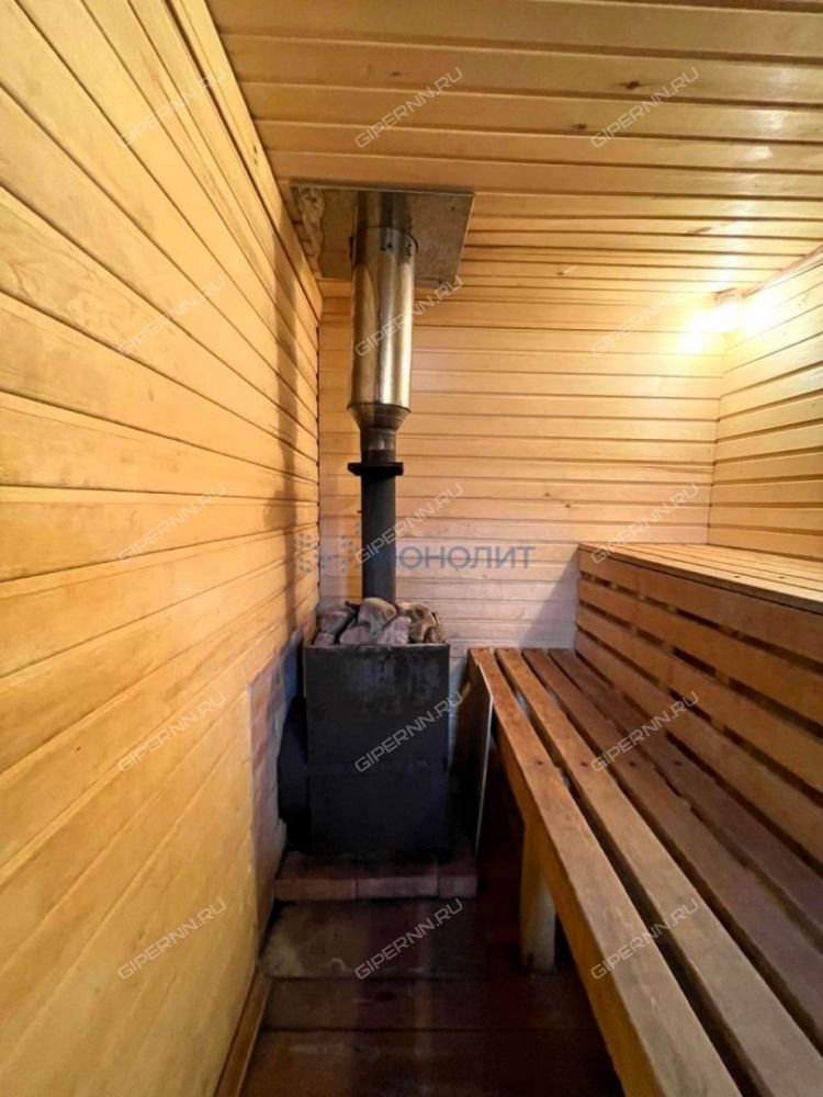 Стены внутри бани обшиты деревянной рейкой.