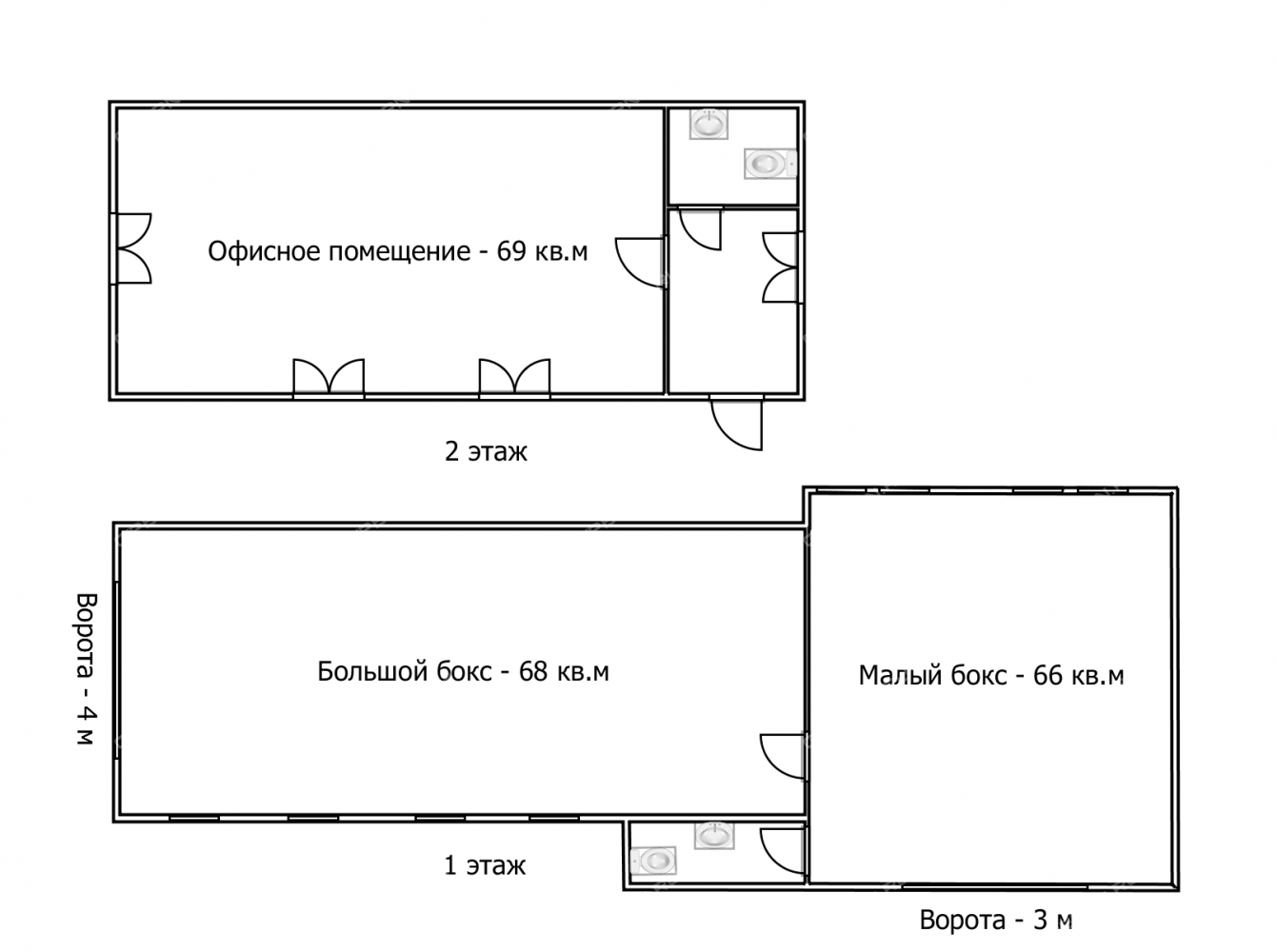 Здание кирпичное, построено в 1996 году, обновлено 2024 г, состоит из трех помещений с отдельными входами с улицы. На 1 этаже - 2 гаражных бокса с окнами. Большой бокс площадью 68 кв.м имеет въезд и ворота высотой 4 м, малый бокс площадью 66 кв.м имеет въезд и ворота высотой 3 м. Малый бокс оборудован санузлом. В большом боксе есть подвальное помещение аналогичной площади высотой 2 м с доступом через 3 люка. Гаражные боксы первого этажа соединены между собой дверью, которую при необходимости можно заблокировать и оставить только отдельные уличные входы.