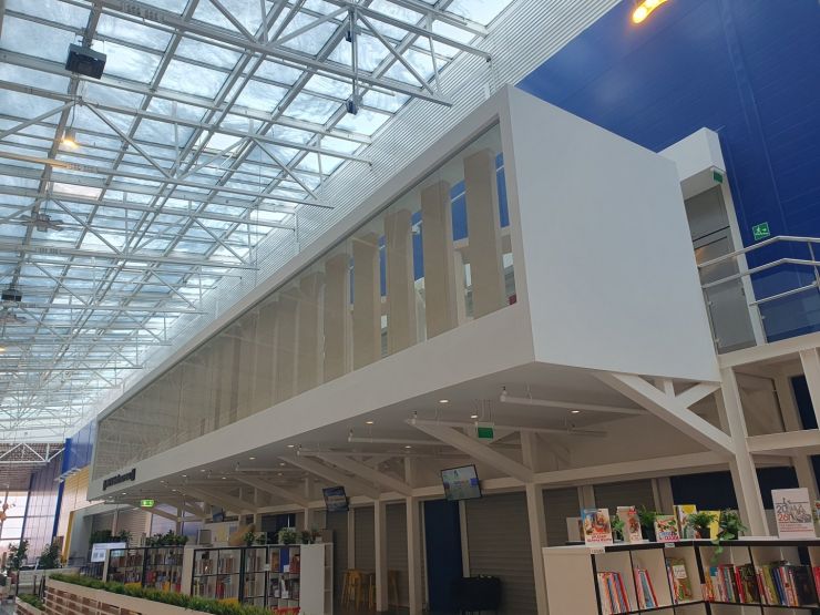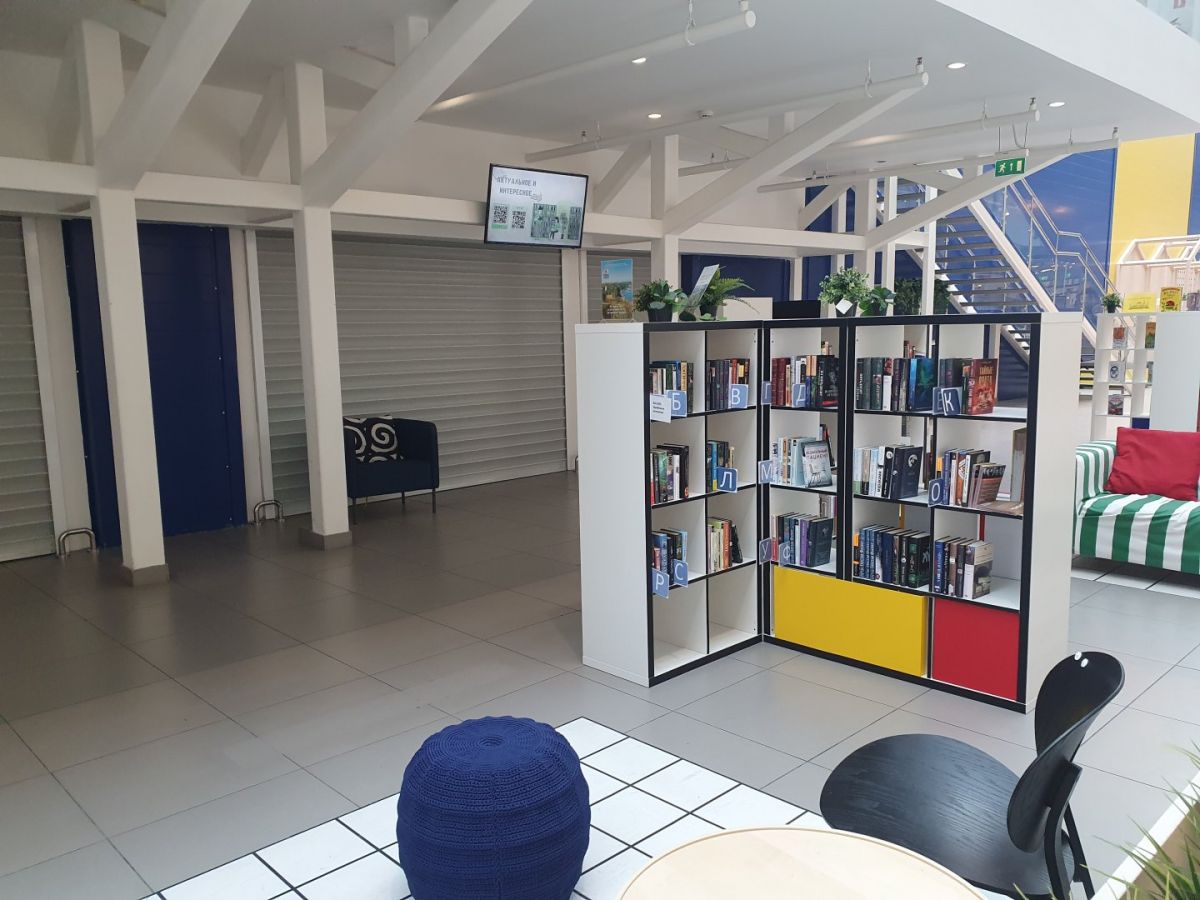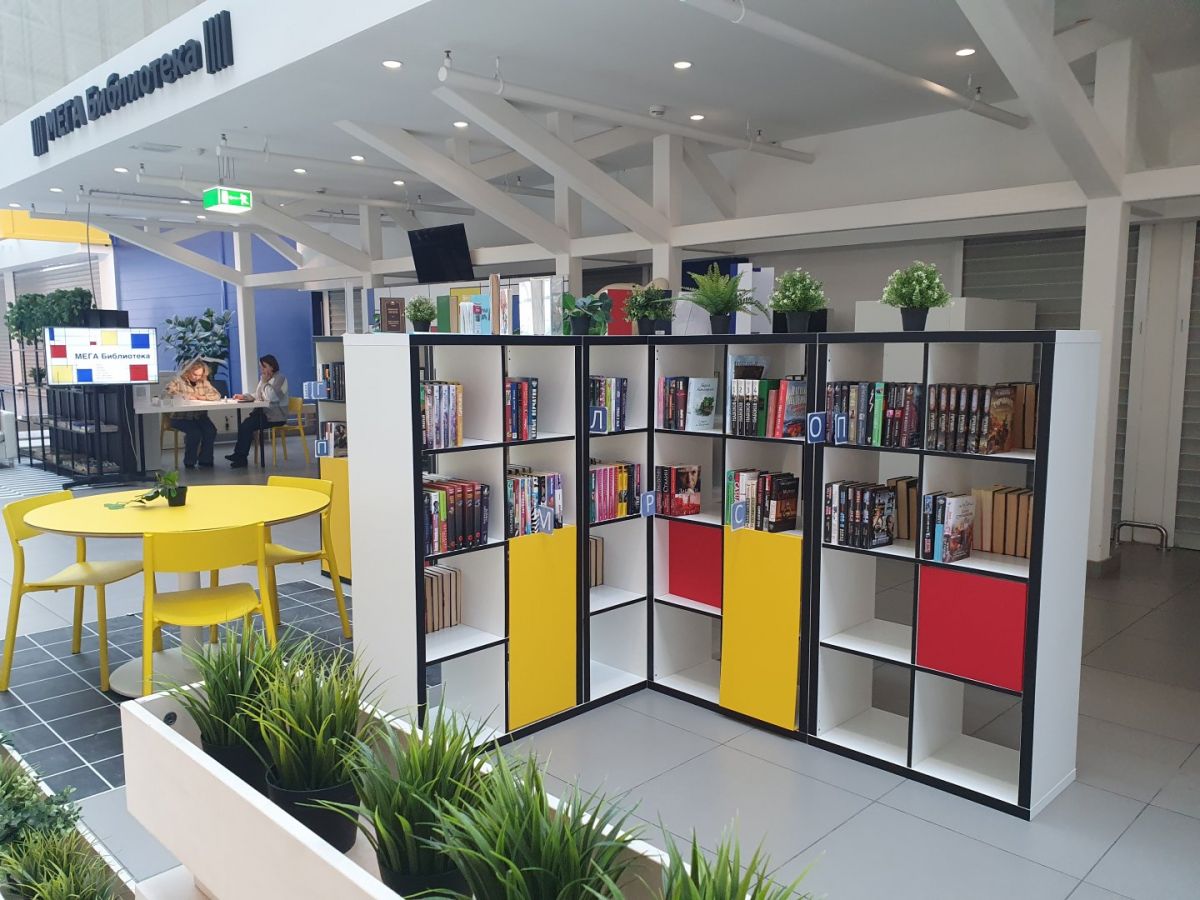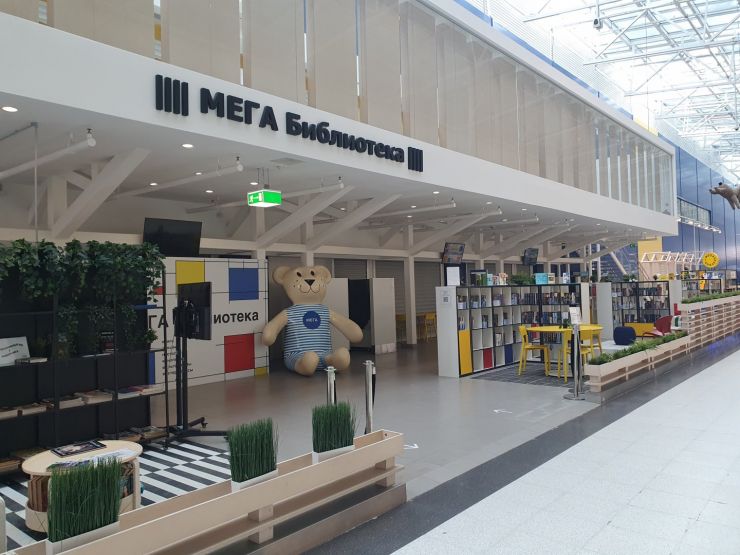Небольшую часть бывшего ресторана IKEA занимает проект «МЕГА Библиотека». Речь идет о балконе и пространстве под ним, которые выходят в холл ТЦ. Здесь гости торгового центра могут почитать книги или бесплатно поработать в коворкинге, также на площадке проводятся творческие встречи и мастер-классы. Пространство по-прежнему оформлено мебелью шведского бренда, а в центре стоит арт-объект в виде узнаваемого игрушечного мишки.