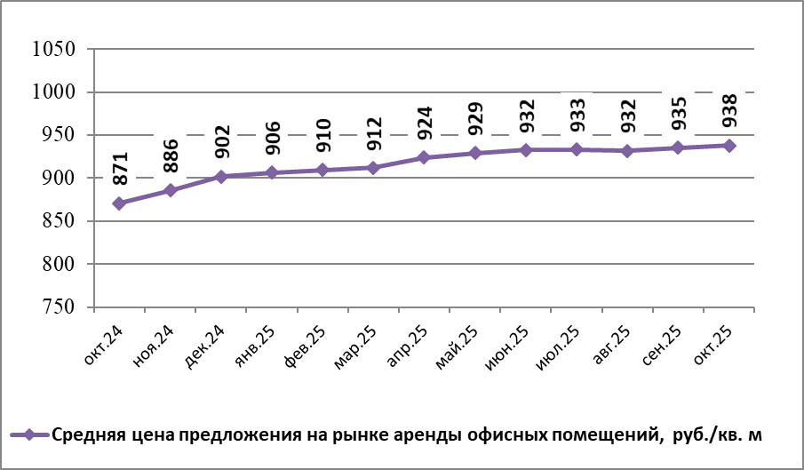 По данным Gipernn.ru на рынке аренды офисных помещений в Нижнем Новгороде октябре 2025 года средняя цена предложения составила 937,87 руб./кв.м. По сравнению с предыдущим месяцем она повысилась на 0,27%.