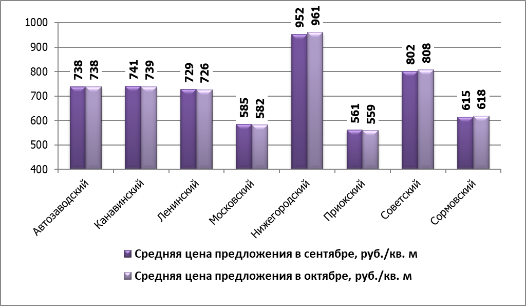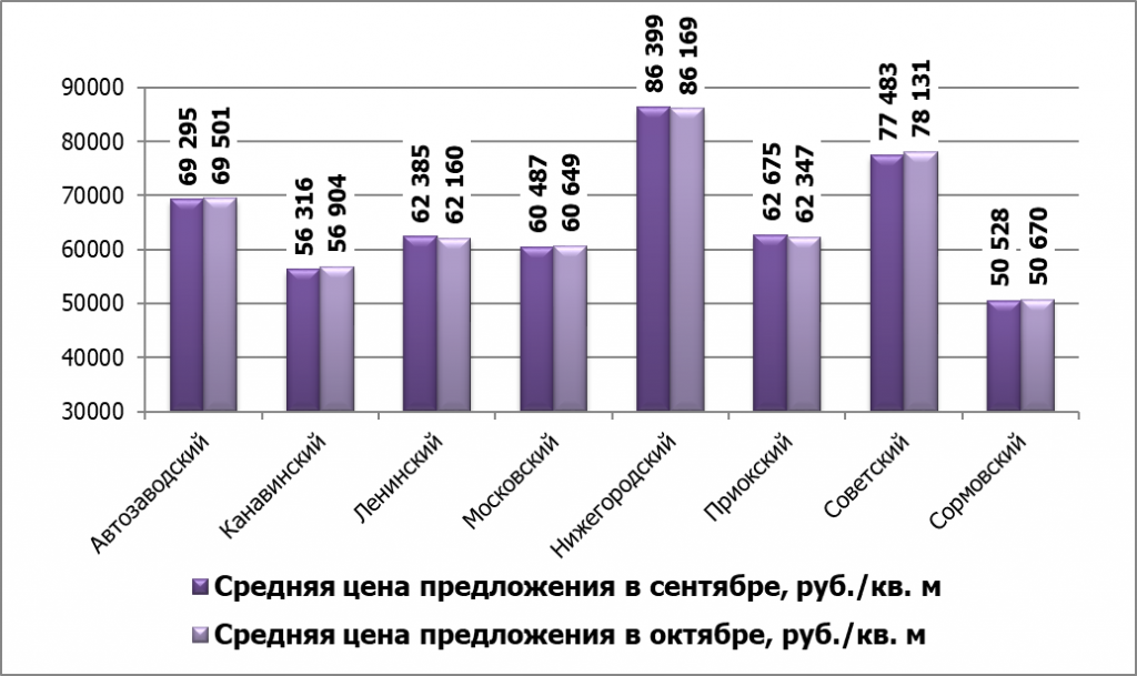 Максимальное в процентном отношении понижение средней цены на рынке продажи офисных помещений в октябре наблюдалось в Приокском районе и составило 0,52% по сравнению с данными за сентябрь.
