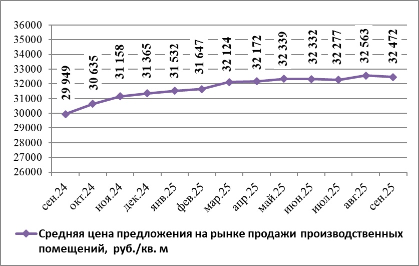 Средняя цена продажи производственных помещений Нижнего Новгорода в сентябре 2025 года составила 32 471,7 руб./кв.м. По сравнению с предыдущим месяцем она понизилась на 0,28%