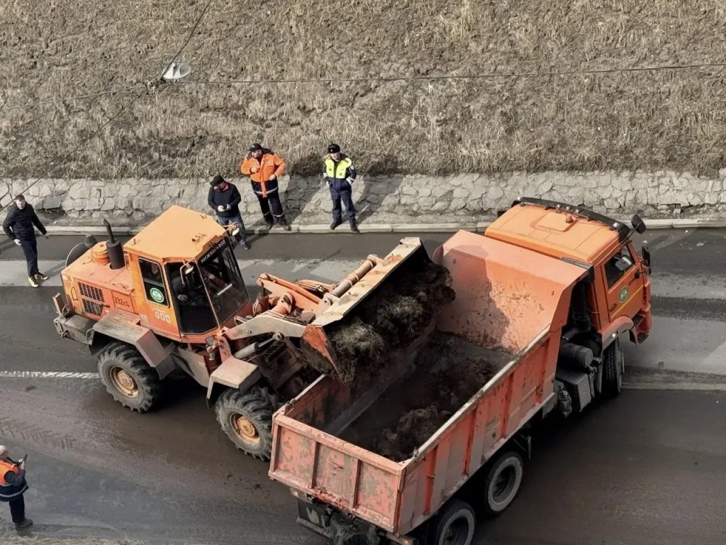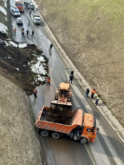 Сейчас техника ликвидирует последствия оползня: сошедший грунт погружают в самосвалы. Сотрудники инженерной защиты города осматривают соседние участки склона.
