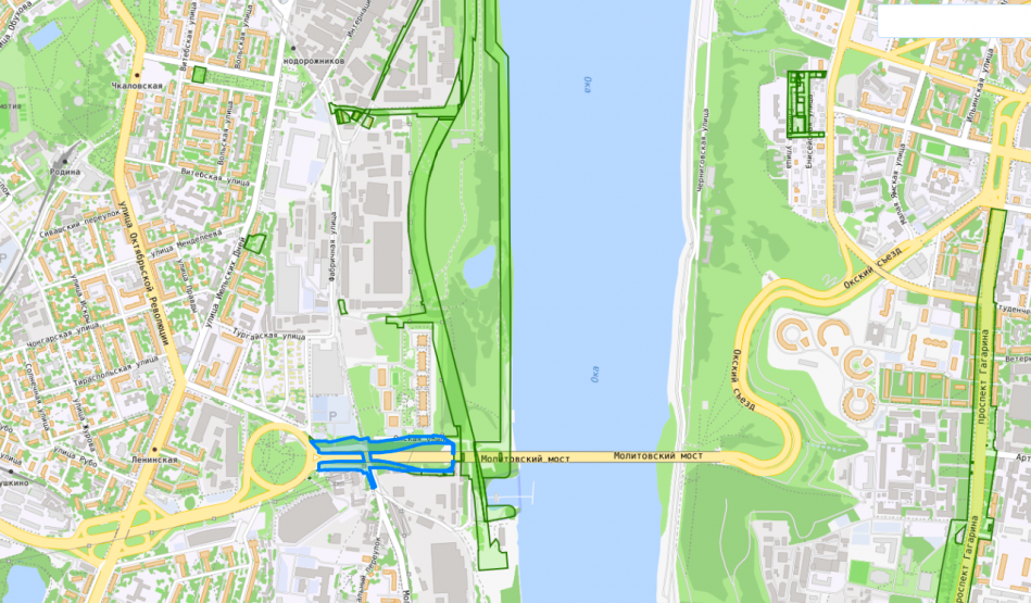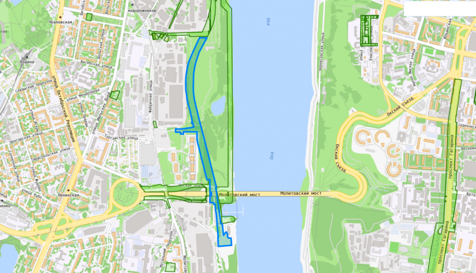Возле Молитовского моста должна появиться еще одна развязка — с площадью Комсомольской: судя по карте, для нее подготовлены четыре участка. Отмежеванные земли под дублер проспекта Ленина заканчиваются в районе Молитовского затона.