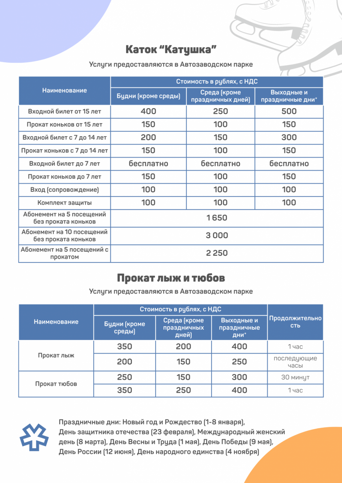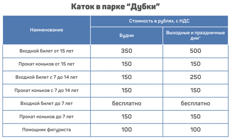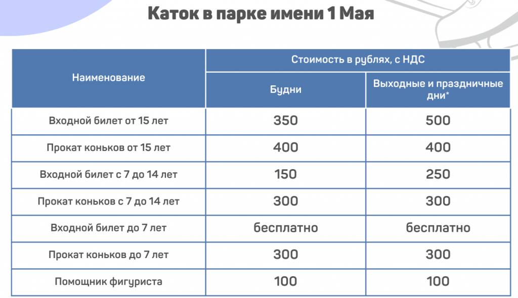 Билет для детей до семи лет — бесплатный. Но если взять коньки на прокат, придется отдать 300 рублей — как в будни, так и выходные. Услуги помощника фигуриста обойдутся в 100 рублей. Также Дирекция проанализирует данные о посещаемости и подумает о введении бесплатных часов катания для пенсионеров.