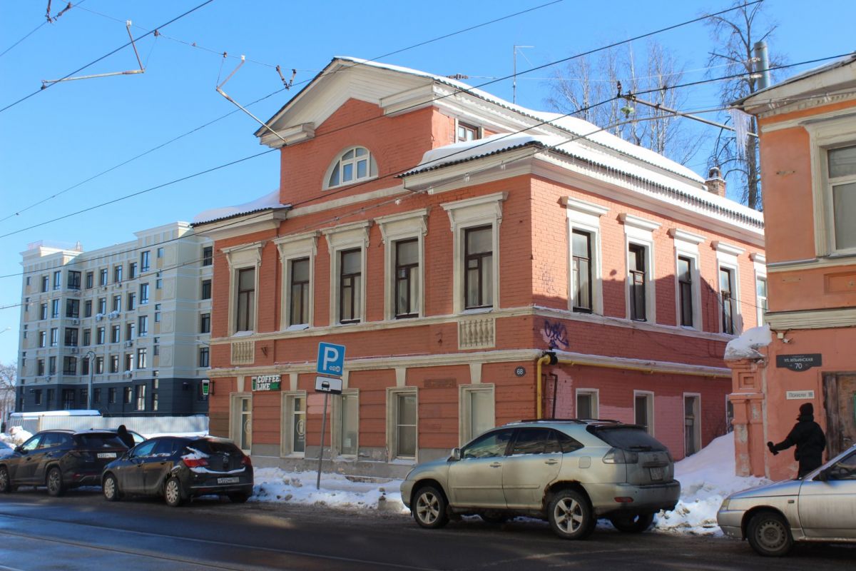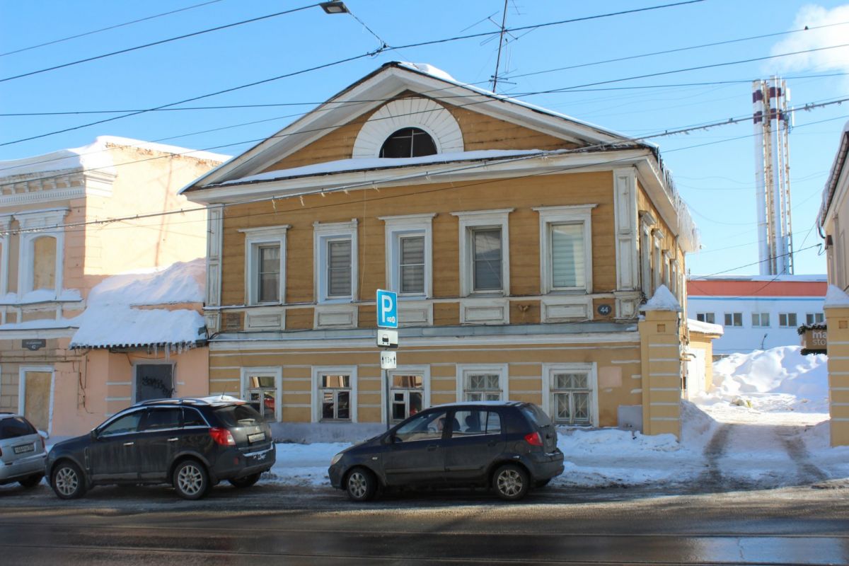 Двухэтажные усадьбы № 44 и 68 были построены в середине XIX века. Первая — деревянная — в прошлом году пострадала от пожара, который перекинулся с соседней Усадьбы Вагина. Огонь повредил крышу и чердак с арочным окном. Впрочем, потом фасад покрасили, и теперь о происшествии ничего не напоминает. Вторая — каменная усадьба с мезонином — известна как Дом А. П. Пуговкина. На первом ее этаже работает кофейня.