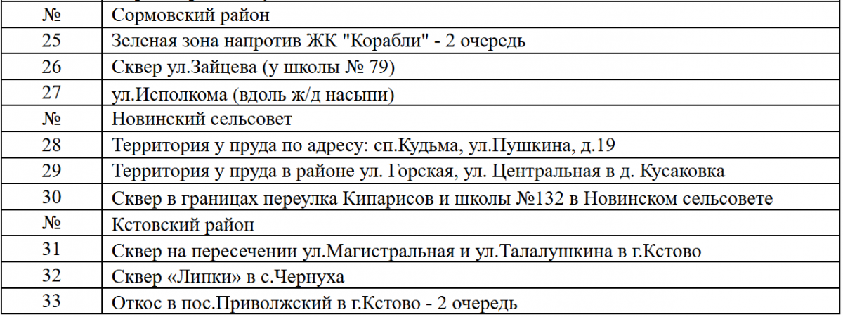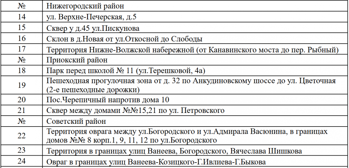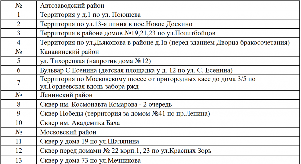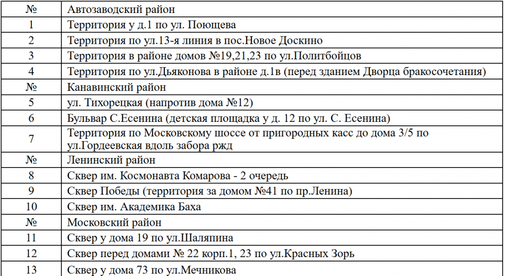 Благоустройство пройдет в рамках программы «Формирование комфортной городской среды» (ФКГС). На общественное голосование вынесут 3–4 пространства в каждом районе Нижнего Новгорода. Их список представлен в таблице: