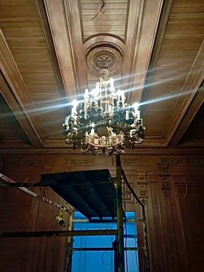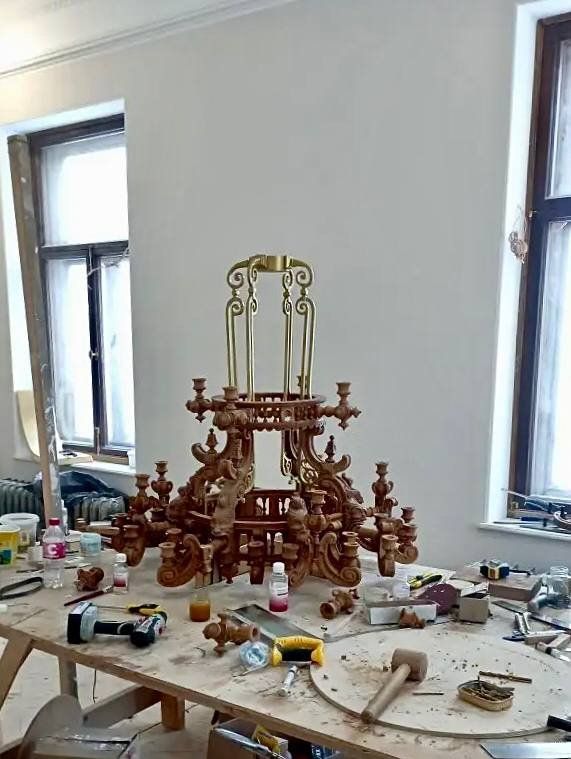 Реставраторы почти завершили восстановление Дубового зала в старинном Доме Бурмистровой, где находится музей. Они собрали первую дубовую люстру и приступили к золочению лепного декора.