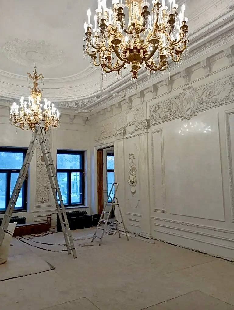 Реставрация богатой лепнины в особняке выполнена на 94%. В такой же степени готовности находятся новые отливы на фасаде исторического здания. Работы по оселковому мрамору, восстановлению стен, дверей из дуба и черновых полов оцениваются в 75–85%.