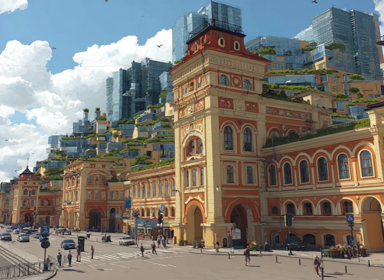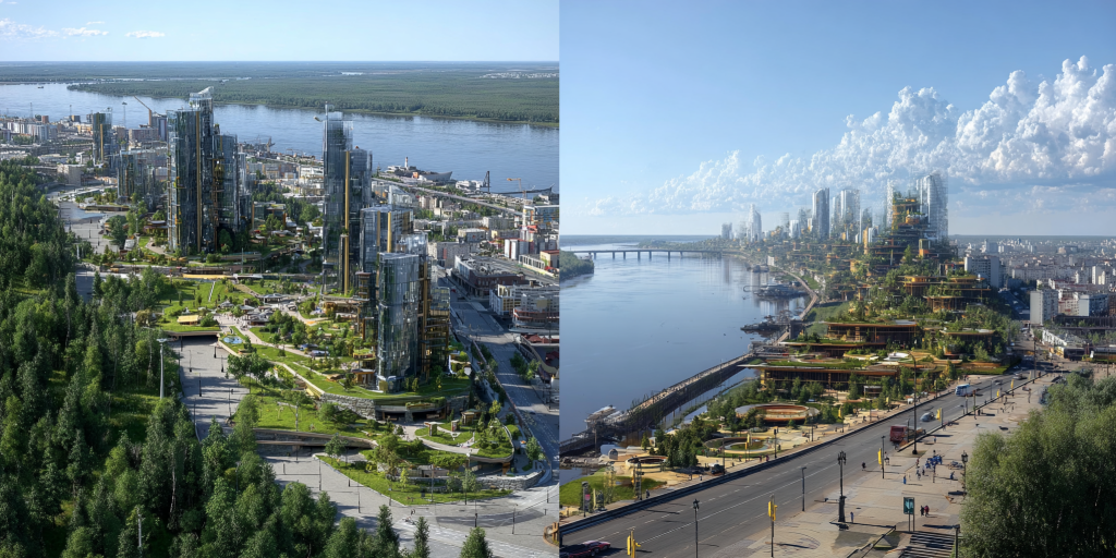 Высота зданий в будущем только вырастет: по мнению ИИ, в Нижнем Новгороде появится множество небоскребов самых разных форм. Некоторые из них будут соединены «воздушными» мостами. На оживленных трассах появятся больше разноуровневых развязок. А вот набережные рек и Дятловы горы останутся зелеными, как и сейчас.