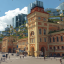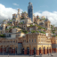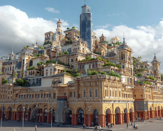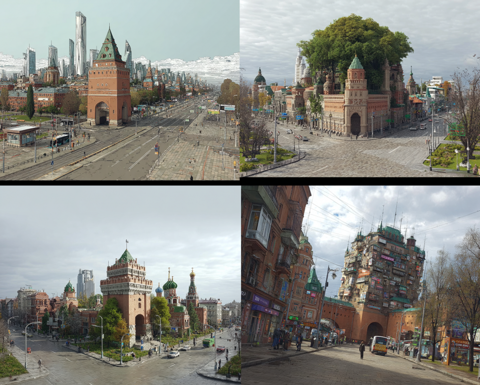 Над Нижегородской ярмаркой искусственный интеллект надстроил несколько уровней, выполненных в едином стиле — смутно напоминающем нынешний. На крыши он «высадил» зелень — кустарники и деревья. В свою очередь, башни кремля вытянулись в высоту вслед за небоскребами и стали выглядеть абсолютно сюрреалистично.