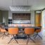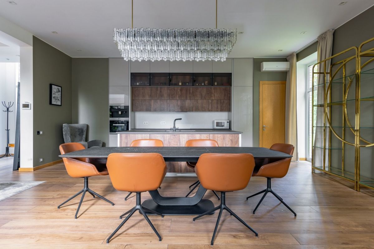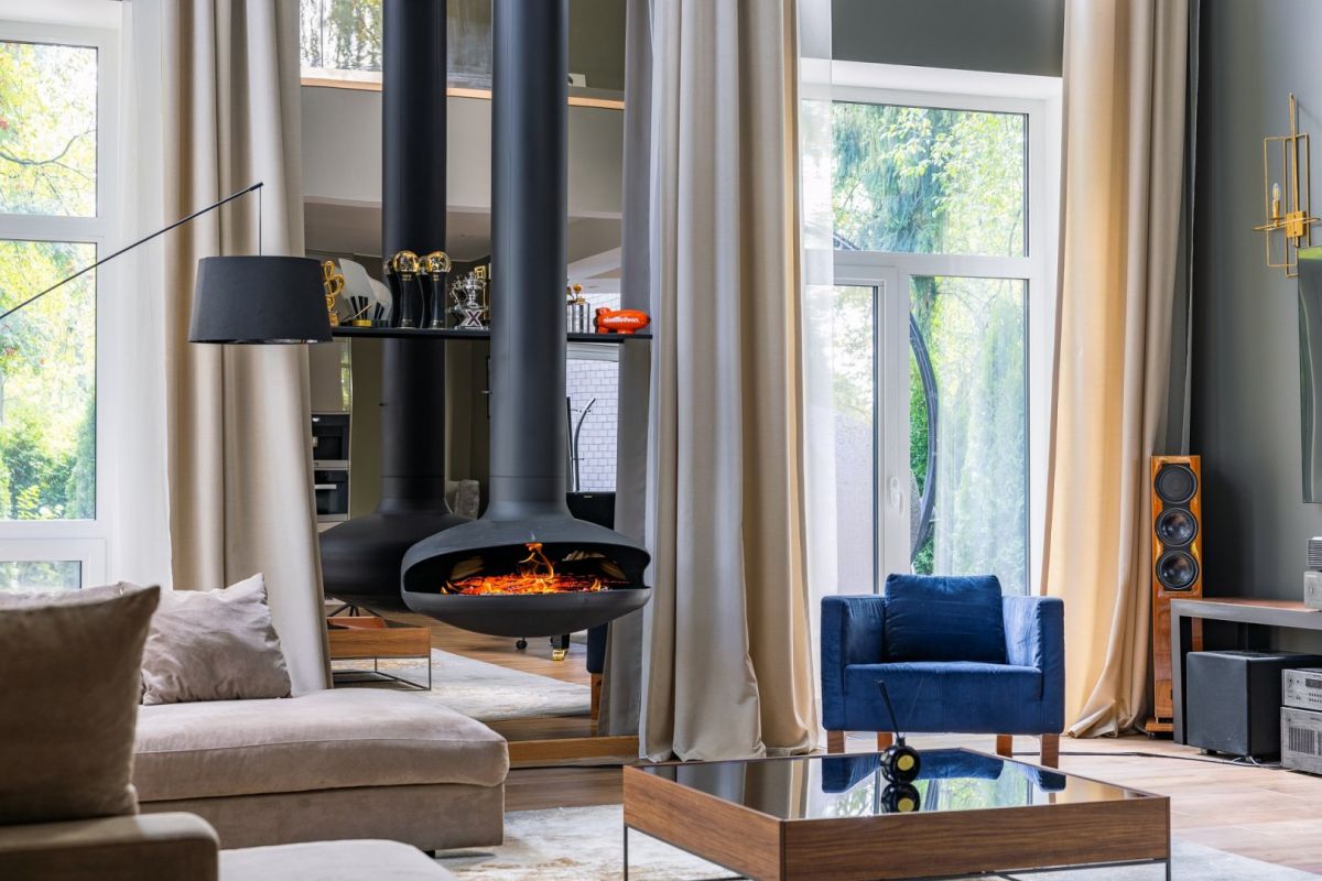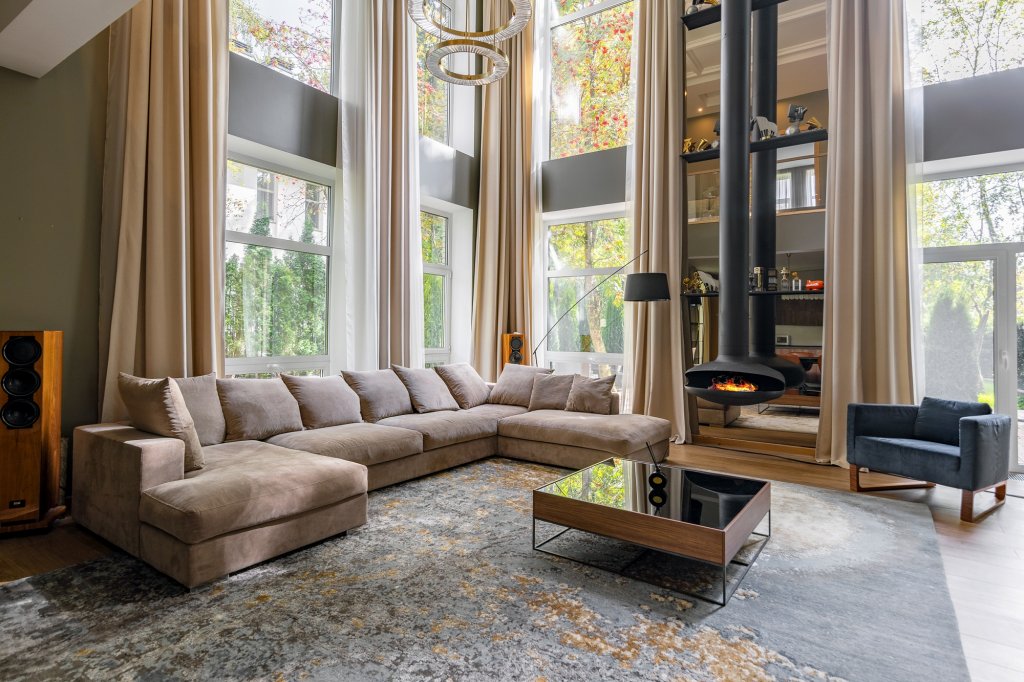 На первом этаже особняка расположена большая гостиная с кухонной зоной, камином, высокими потолками и витражным остеклением. Хозяин поделился, что она отлично подходит и для спокойного отдыха, и для многолюдных вечеринок.