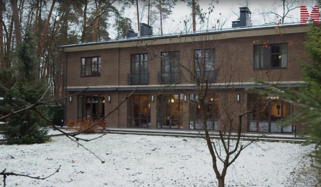 Коттедж находится в окружении леса, на участке площадью 15 соток также расположены гостевой дом с баней, гараж на две машины и беседка-барбекю. Всего клубном поселке «Конус» насчитывается 22 дома, спроектированных в единой архитектурной концепции.