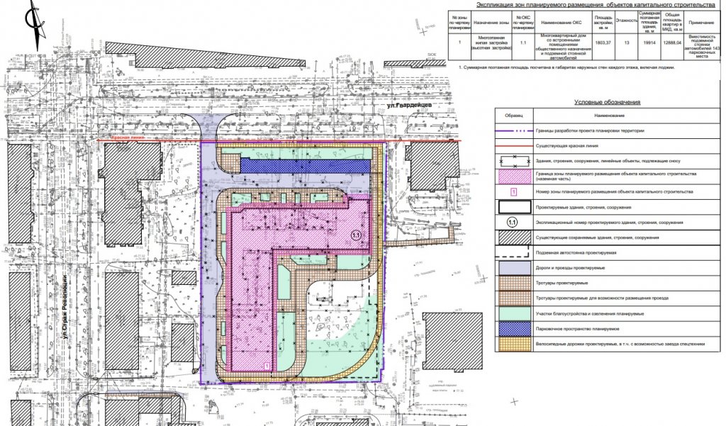 Новый дом будет включать 258 квартир и встроенные помещения общественного назначения. Вместимость подземной парковки составит 143 машино-места. На территорию планируется сделать два въезда: основной, с улицы Гвардейцев, и дополнительный — в районе школы № 86 по улице Страж Революции.