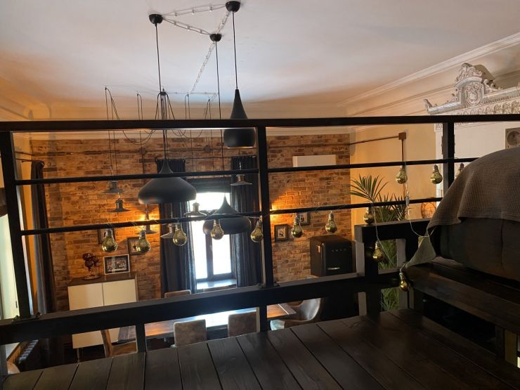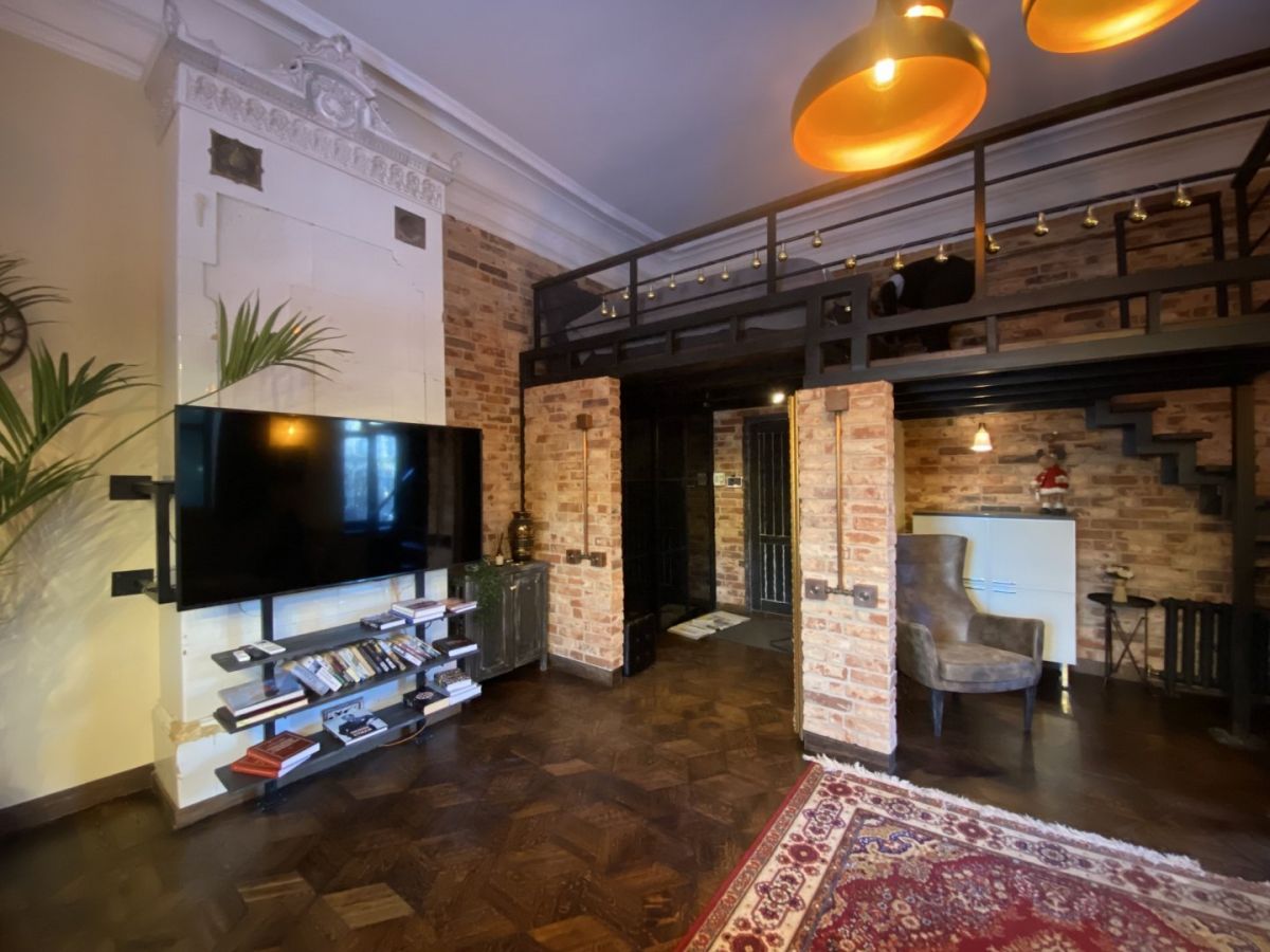 Однушка состоит из прихожей с большим зеркалом, 9-метровой кухни и просторной жилой комнаты с обеденной зоной. Спальное место расположено на антресоли под потолком, куда ведут ступени. Особенности интерьера — кирпичные стены, дубовый паркет, большие окна, состаренные двери и мебель, медные выключатели и антикварные светильники.