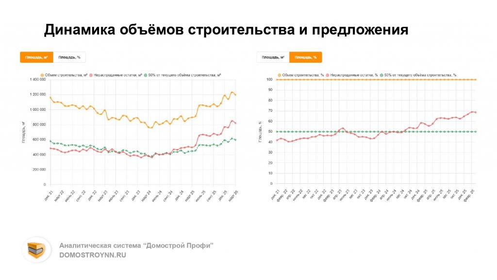 По состоянию на март 2026 года в Нижнем Новгороде строилось порядка 1,2 млн кв.м многоквартирного жилья. При этом доля нераспроданных остатков уверенно растет: в прошлом месяце их общая площадь составляла более 800 тысяч кв. м, то есть две трети от всего объема. Таковы данные «Домострой Профи».