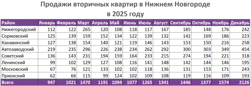 Больше всего вторичных квартир из месяца в месяц продается в Автозаводском районе. Всего по итогам 2025 года здесь было заключено 3408 сделок. В топ-3 самых популярных также входят Советский и Нижегородский, где зарегистрировали 2482 и 1880 договоров купли-продажи соответственно. Меньше всего готовых квартир покупают в Приокском районе — 1322 за весь прошлый год.