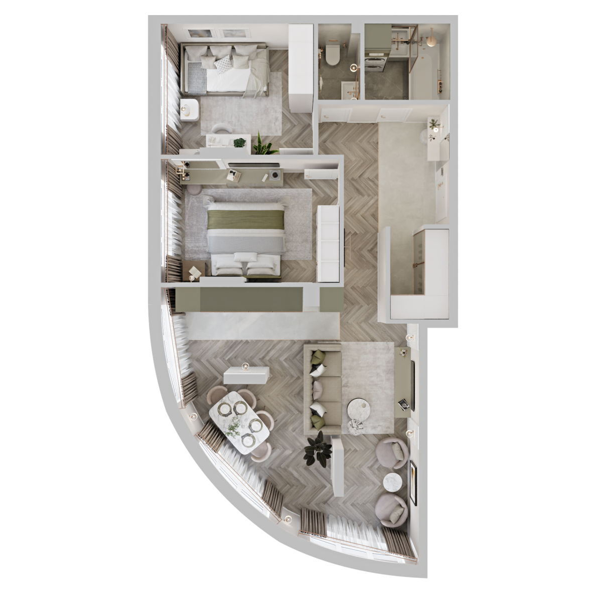Правильная геометрия комнат. Прямоугольная или близкая к квадрату форма считается оптимальной. В таких комнатах проще расставить мебель и предметы интерьера, в отличие от вариантов с так называемыми мертвыми зонами. Неровные углы и выступы «съедают» полезное пространство, а иногда из-за них приходится заказывать мебель по индивидуальным параметрам. Присмотримся к проектам ГК «Подкова»: изолированные комнаты, правильная форма. Но есть и нестандартные лоты для ценителей оригинальных решений. Например, в ЖК «Подкова на Волге» можно выбрать квартиру с радиусной стеной и увеличенным количеством окон. А еще в доме первой очереди представлен эксклюзивный лот с террасой.