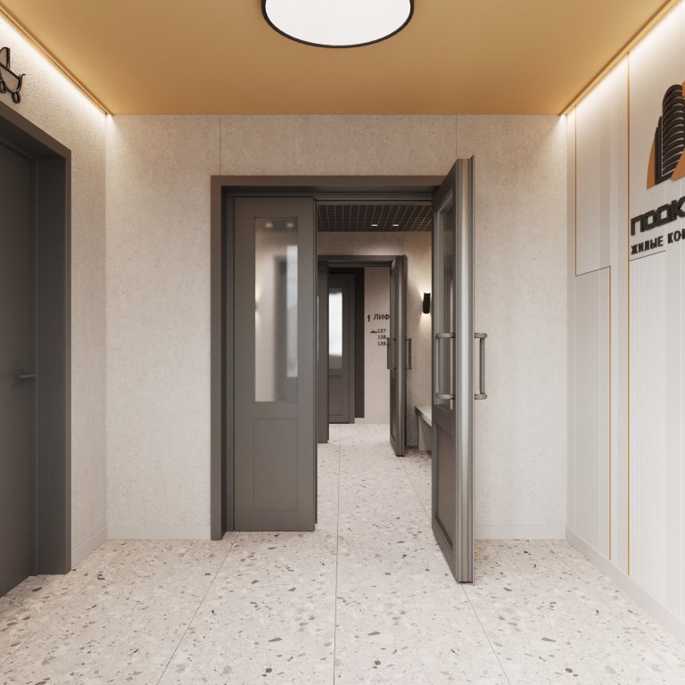 Дизайнерский холл. В жилых комплексах высокого класса обустраивают стильное лобби, а в массовом сегменте все сделано просто, но представительно: фирменные оттенки, понятная навигация, мягкое освещение. Все проекты ГК «Подкова» отличают авторский дизайн входных групп, выполненный в теплых природных тонах, а также практичный сервис для резидентов.