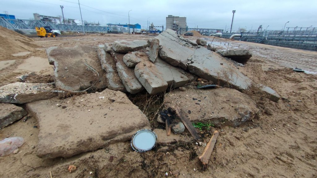 Так, при осмотре были обнаружены навалы отходов между вторичными отстойниками и аэротенком. Там лежали куски бетона, металлический лом, древесина, которые положено размещать на специально оборудованных площадках. А участок площадью 1,7 тысячи кв. м оказался завален грунтом, загрязненным строительными отходами.